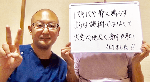 痛みの原因が何かという事を説明してもらい、施術は、初めはタクシーで行き帰りしていましたけど、4回目くらいになったら歩けるようになって、バスで通院できるようになりました。痺れもだんだんなくなって上を向いて寝られるようになったんですよ、嬉しかったです。