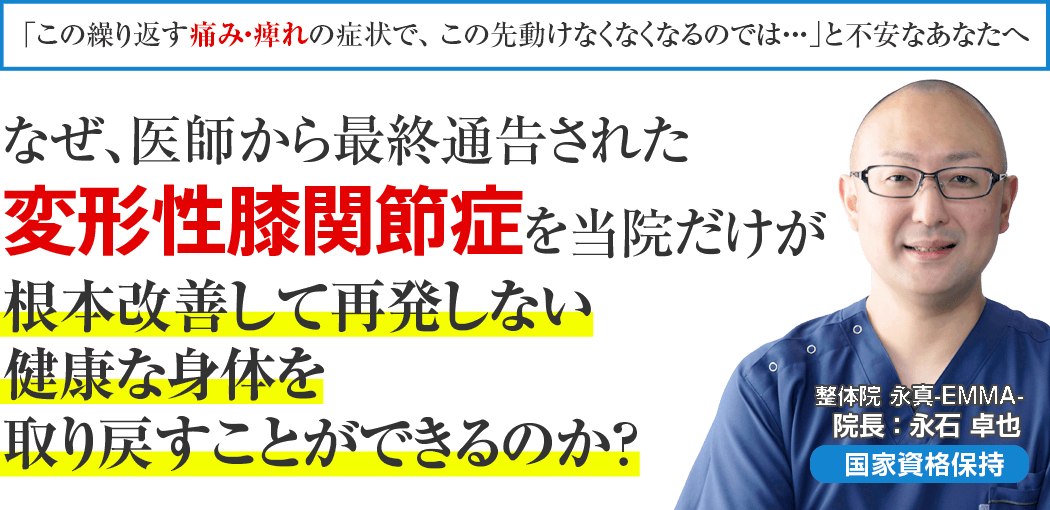 もしあなたが今、上記のようにお悩みなら、もしあなたが今、ほんの少しでも心のどこかに、よくなりたいと思うのなら整体院 永真(EMMA)に来院し、そのつらい変形性膝関節症を徹底的に根本改善しませんか?